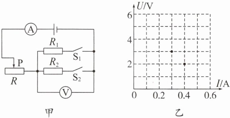 【典型例题2】如图甲所示的电路中,电源电压保持不变,先闭合开关$S_1、$断开$S_2,$调节滑动变阻器的滑片P至某位置;保持滑动变阻器滑片P的位置不变,再断开开关$S_1、$闭合$S_2,$电流表示数减小,将两次实验的电压表和电流表的示数的数据描点在坐标系中,如图乙所示。则$R_1$