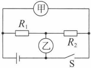 【典型例题4】如图所示,电源电压U保持不变,定值电阻A、B的阻值分别为$R_1、$$R_2。$在甲、乙两处分别接入电压表,闭合开关S,测得$U_1$:$U_2=3$:2;断开开关S,拆去电压表,并在甲、乙两处分别接入电流表,此时$I_1$:$I_2$是(