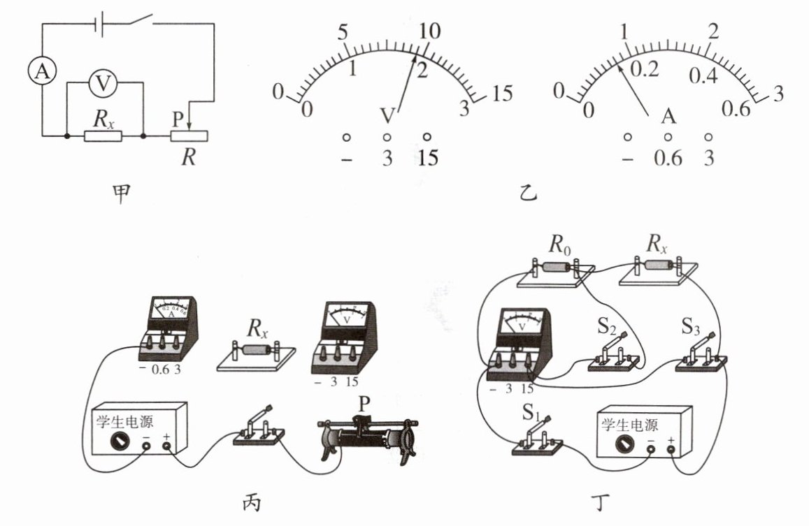 (4)该同学进行了实验创新,利用阻值为R₀的定值电阻和电压表等器材,测量阻值Rₓ。他设计了如图丁所示的电路,经检查无误后进行实验。请将实验过程补充完整:
