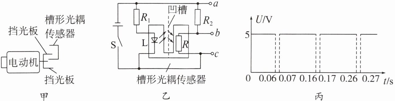 如图甲所示,小明在电动机的转动轴上固定一个“山”字形挡光板,利用槽形光耦传感器来测量电动机的转速。槽形光耦传感器两侧分别装有红外发光二极管L,以及阻值为R的光敏电阻,当光敏电阻接收到二极管L发出的红外线时,电阻为0,未接收到红外线时,电阻很大,相当于断路。图乙为测量电路图,电源电压为5V。