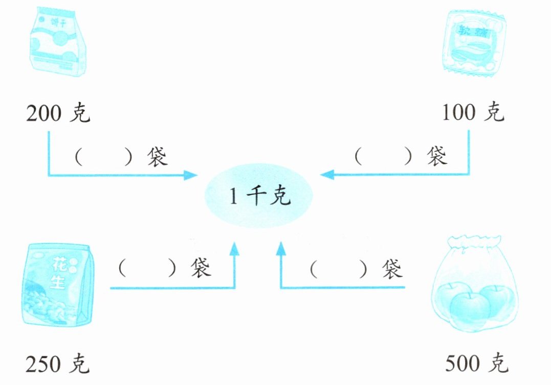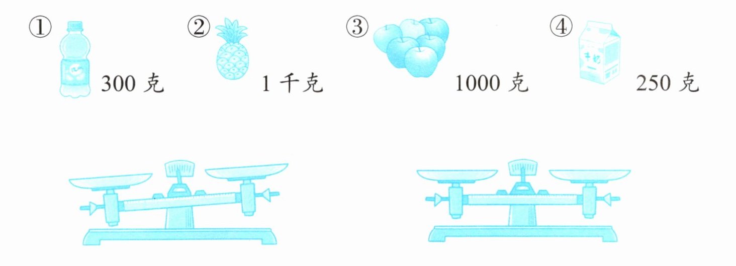 注:由于题目未明确天平左右托盘放置要求(如是否需平衡或比较轻重),根据常见题型,优先考虑等重组合。因1千克=1000克,故②和③质量相等,可分别放于天平左右托盘使平衡;①(300克)和④(250克)为不等重,可比较轻重。答案形式以序号填入托盘,此处文字说明核心结论。最终答案可表示为: