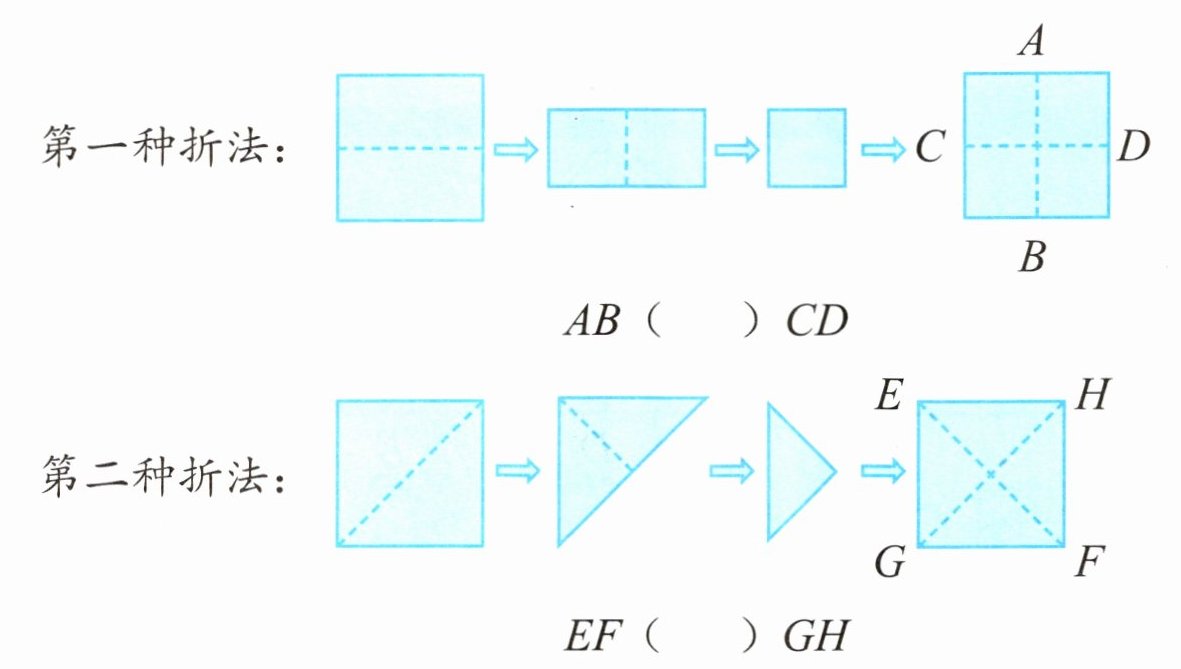 5. 把一张正方形纸按照下面的方法对折两次后打开,会出现两条折痕。这两条折痕的位置有什么关系?用符号表示出来。