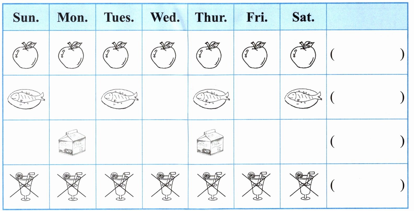 Ⅳ. Look and write. 仔细观察下列图表中 David 的饮食情况,在括号中写出相应的单词 (always, sometimes, often, never),然后造句。
