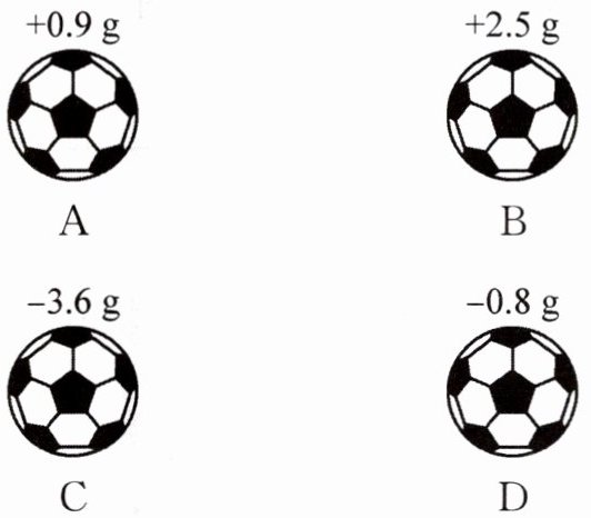 7. 如图,检测 4 个足球,其中超过标准质量的克数记为正数,不足标准质量的克数记为负数,从轻重的角度看,最接近标准的是(