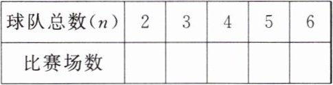 2. 一次足球比赛中,有$n(n\geq2)$个球队参加比赛,假设此次比赛为单循环比赛(参加比赛的每一个队都与其他所有的队比赛一场),球队总数与总的比赛场数如下表.