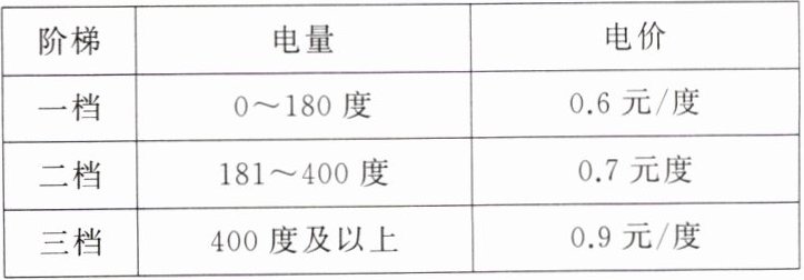1. 为响应国家节能减排的号召,鼓励居民节约用电,各省先后出台了居民用电“阶梯价格”制度,如表中是某省的电价标准(每月),例如:王女士家 6 月份用电 420 度,电费 = 180×0.6 + 220×0.7 + 20×0.9 = 280 元,实行“阶梯价格”收费以后,居民用电