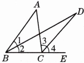 1. 已知$\triangle ABC$中,$∠ABC的平分线与∠ACB外角平分线相交于点D$,试猜想$∠D与∠A$的大小关系,并说明理由。