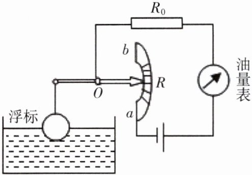 2. 在显示汽车油箱内油量的装置模拟示意图中,电压$U$一定时,油箱中浮子随油面下降而落下,带动滑杆使滑动变阻器滑片向上移动,从而改变电路中的电流,电流表的示数对应油量体积,把电流表刻度改为相应油量体积数,由此知道油箱里剩余油量。在不考虑其他因素的条件下,油箱中油的体积$V与电路中总电阻R_{总}(R_{总}= R + R_{0})$是反比例关系,电流$I与R_{总}$也是反比例关系,则$I与V$的函数关系是(