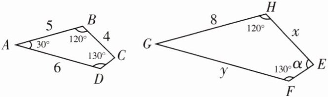 在四边形$ABCD$中,$\angle A=30^{\circ}$,$\angle B=120^{\circ}$,$\angle D=130^{\circ}$,则$\angle C=80^{\circ}$,所以$\alpha=80^{\circ}$.由于$AB$和$GH$是对应边,所以$x=6.4$,$y=9.6$.