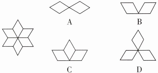 3. 如下左图所示的图案是由六个全等的菱形拼成的,它也可以看作是以一个图案为“基本图案”,通过旋转得到的。以下图案中,不能作为“基本图案”的是(