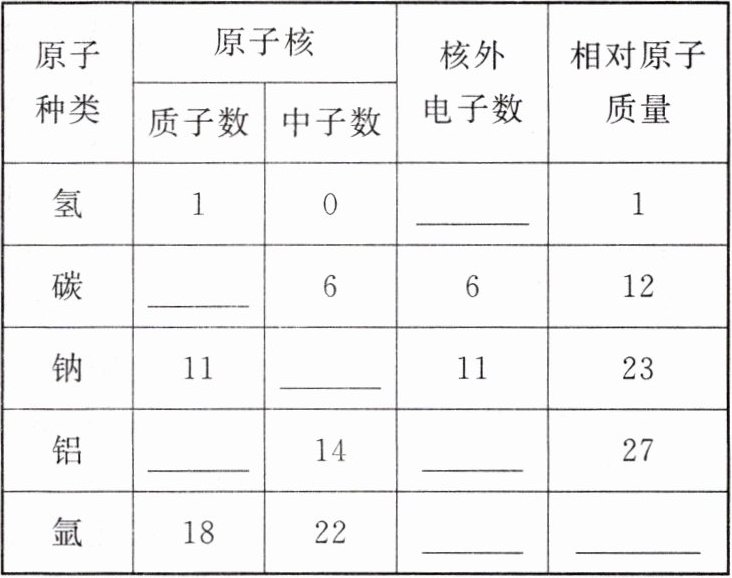 (1)原子种类原子核核外电子数相对原子质量质子数中子数氢1011碳66612钠11121123铝13141327氩18221840(2)①质子 ②中子 ③质子数+中子数