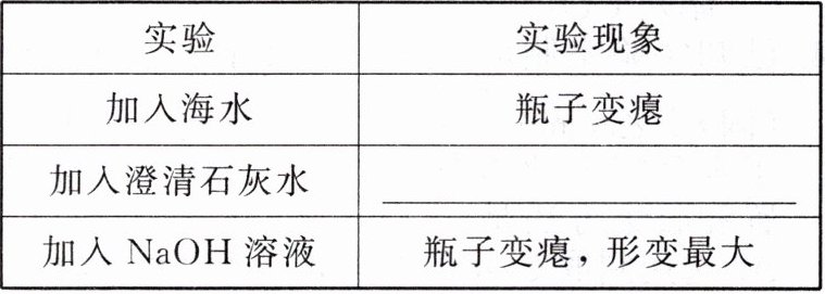 ;假设二:海水吸收二氧化碳的效果好;假设三:氢氧化钠溶液吸收二氧化碳的效果好。【设计并实施实验】“化海畅游队”向充满${CO_{2}}$的软塑料瓶中分别加入等量的液体,迅速拧紧瓶盖振荡,并记录实验现象。