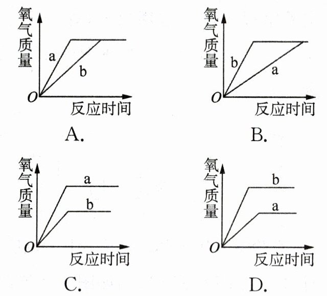 9. a、b 两支试管,b 试管内有少量二氧化锰,现同时向两个试管中滴加等质量的过氧化氢溶液,能正确表示 a、b 两支试管放出氧气的量(纵坐标)与反应时间(横坐标)关系的是(
