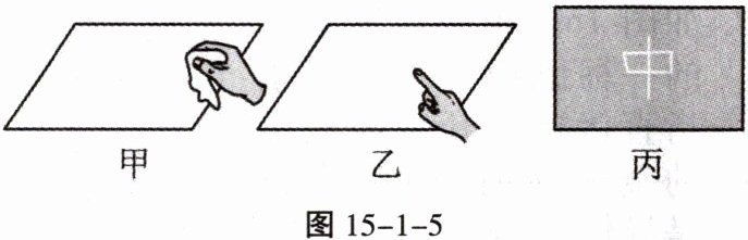 11. 小明模拟静电复印原理。他先用丝绸快速摩擦整块塑料板(图 15 - 1 - 5 甲),再用手指在塑料板上写了一个“中”字(图 15 - 1 - 5 乙),然后在塑料板上均匀地撒上一层细小干木屑,将塑料板缓慢竖起,在重力作用下“中”字内干木屑下落,“中”字就在塑料板上显现出来了(图 15 - 1 - 5 丙),“中”字能显现出来的原因:摩擦过的塑料板