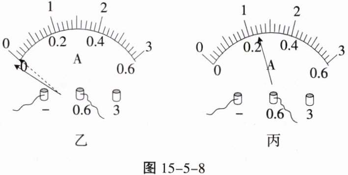 。(3)在实验过程中,电流表的测量范围为 $ 0 \sim 0.6 \, A $,电流表的示数如图 15-5-8 丙所示,则此时的电流是
