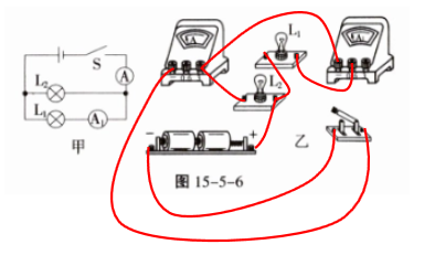 9. 根据图 15-5-6 甲所示的电路图,在图 15-5-6 乙中的实物图上用笔画出连线。