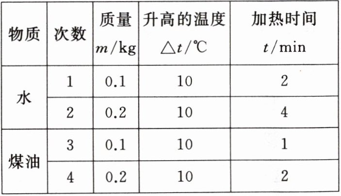 10. 某同学在做“比较不同物质的吸热能力”的实验时,使用相同的电加热器给水和煤油加热,得到的实验数据如下表: