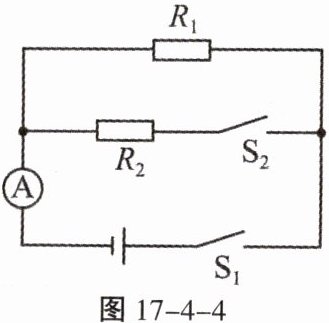 8. 如图17-4-4所示的电路中,$R_{1}$、$R_{2}$为定值电阻,$R_{1}= 10\Omega$。只闭合开关$S_{1}$时,电流表的示数为$0.4A$;当$S_{1}$、$S_{2}$均闭合时,电流表的示数为$0.6A$。求: