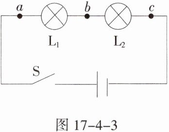 7. 如图17-4-3所示,电源电压为6V,闭合开关S后,发现两灯均不亮。这时若用电压表测a、b两点间的电压示数为0,测b、c两点间的电压,示数为6V,则表明电路发生的故障是