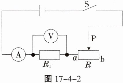 5. 在如图17-4-2所示的电路中,$R_{1}= 2\Omega$,现将$R_{1}换成4\Omega的电阻R_{2}$,为保持电压表的示数不变,滑动变阻器滑片$P$应该(