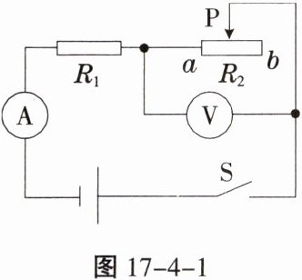 4. 如图17-4-1所示,电源保持$6V$的电压不变,开关$S$闭合后,电流表的示数是$0.2A电压表的示数为2V$,则电阻$R_{1}$的阻值是