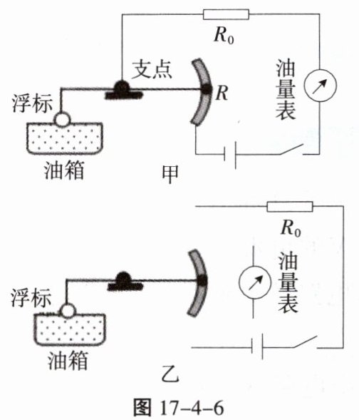 (4)改装设计:用电压表代替电流表做油量表,图17-4-6乙已画出部分电路,请在乙图中完成电路的设计。要求:当油箱中的油用完时,油量表(电压表)的示数为零。
