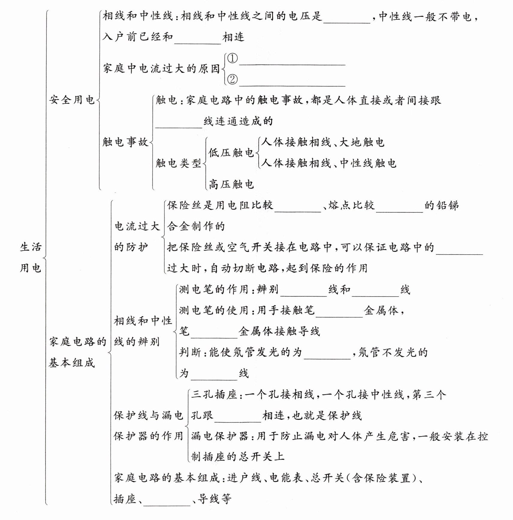 - 家庭电路的基本组成:进户线、电能表、总开关(含保险装置)、插座、
