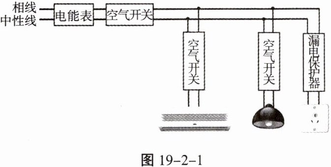 1. 如图19-2-1所示,是安装了空气开关和漏电保护器的住宅内配电系统,它们都是安全用电的小卫士。当家庭电路中用电器的总功率过大或发生