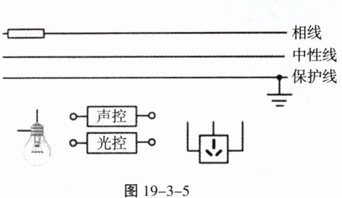 5. 如图 19 - 3 - 5 所示,请用笔画线代替导线,将图中元件接入家庭电路中,要求:①声控开关和光控开关同时控制电灯亮与灭;②三孔插座单独接入。