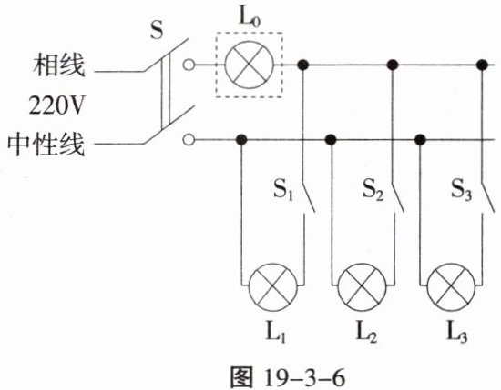 6. 电工师傅常用一只额定电压为 $220\ V$ 的灯泡 $L_0$(检验灯泡)取代保险丝来检查新安装的照明电路中每个支路的情况,如图 19 - 3 - 6 所示。当 $S$ 闭合后,再分别闭合 $S_1$、$S_2$、$S_3$(每次只能闭合其中之一)时,可能出现以下三种情况(短路、断路或正常),试判断并说明理由。