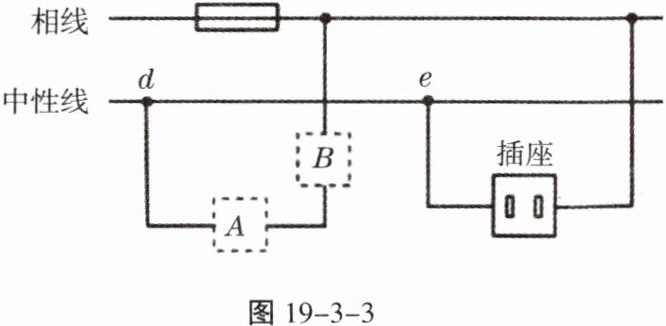 3. 如图 19 - 3 - 3 是小红家中电路的一部分,图中 $A$ 和 $B$ 位置接入的是开关 $S$ 和灯泡。小红闭合开关 $S$ 后(其他用电器均断电),灯泡亮了一段时间后熄灭,她用试电笔分别测试了图中插座的两个孔,发现试电笔氖管都能发光。若故障只有一处,下列说法中正确的是(