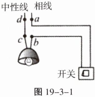 1. 如图 19 - 3 - 1 所示电路,开关闭合后,灯不发光。用试电笔接触 $a$、$b$、$c$ 三处,氖管都发光;接触 $d$ 处,氖管不发光。则故障可能是(