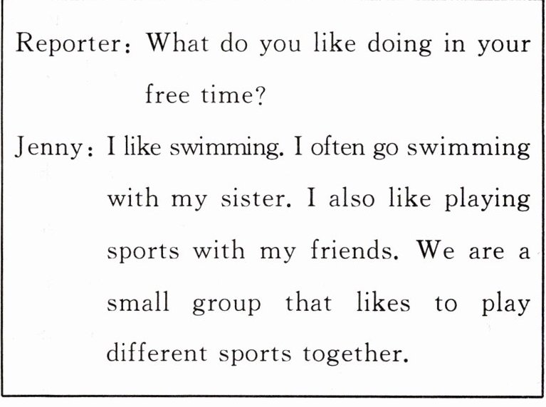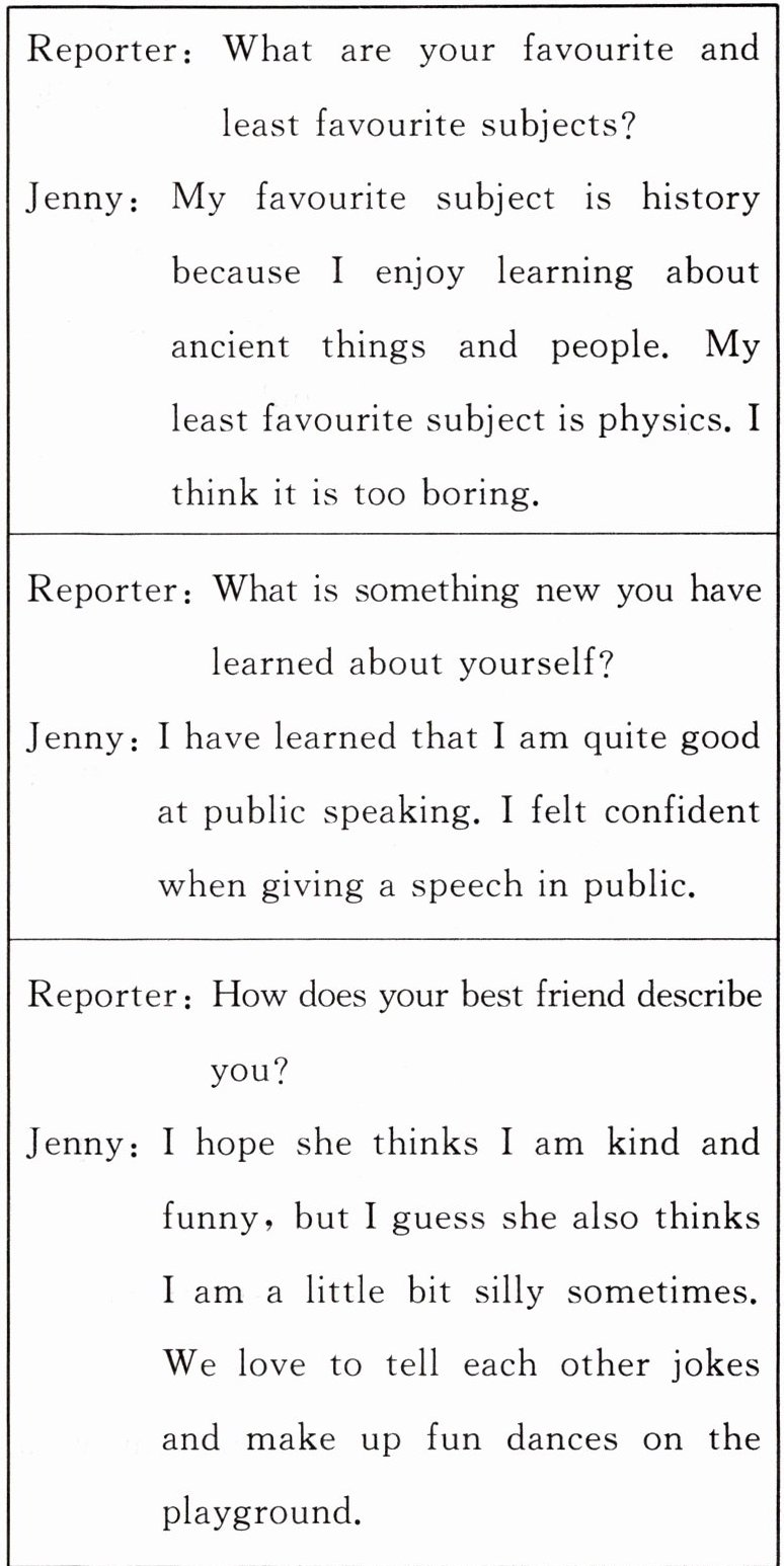 Class is over and a reporter for the school newspaper is interviewing a student named Jenny.