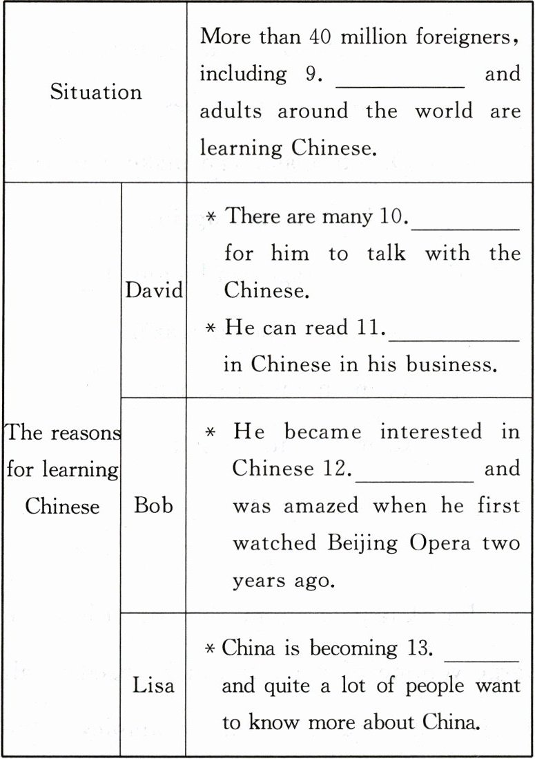 听短文,然后根据表格提示和所听内容完成下列各小题(每空 1 词)。在听该短文之前,你将有 15 秒钟的时间阅读表格中的内容。听完该短文后,你将有 2 分钟的时间检查答案,并将正确答案填入相应的空白处。该短文读两遍。