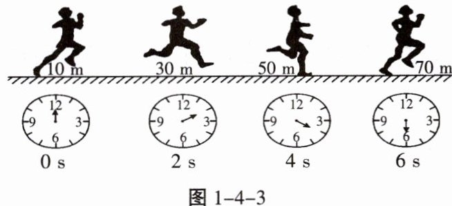 5. 如图 1-4-3 所示,将运动员跑步的路程分成长度相同的三段,由图中秒表可知运动员通过每段路程所需时间,从图中可见运动员在此运动过程中的速度是 (