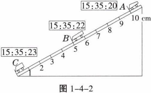 4. 小华同学在“测量小车运动的速度”的实验中,设计了如图 1-4-2 所示的实验装置:小车从带刻度(分度值为 1cm)的斜面顶端由静止下滑,图中的时间是小车到达 A、B、C 三处时电子表的显示: