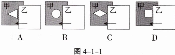 7. 在探究小孔成像的综合实践活动中,为了研究孔的大小对光斑形状的影响,小王设计了四种开有不同形状孔的卡片甲,并用另一张卡片乙覆盖在甲上,如图 4 - 1 - 1 所示。接着,从图示位置沿箭头方向水平移动乙,观察光斑形状的变化情况。下列合乎要求的是(