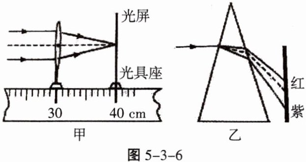 。(3)小峰回想起白光经三棱镜后,光屏上自上而下出现了红、橙、黄、绿、蓝、靛、紫的色带(如图5-3-6乙所示),受此启发,于是他选取焦距为10.0cm的凸透镜,用红光和蓝光来进行图甲的实验,实验结论:对同一凸透镜,
