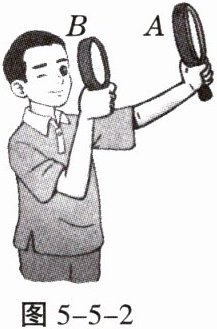 5. 取两个焦距不同的放大镜,一只手握住一个(A 透镜的焦距大于 B 透镜的焦距),通过两个透镜看前面的物体,如图 5 - 5 - 2 所示,调整两个放大镜间的距离,直到看得最清楚为止。物体变大了还是变小了?把两个放大镜的位置前后对调,你有什么新的发现?如果两个透镜的焦距一样时,重复以上步骤,看看又有什么发现?