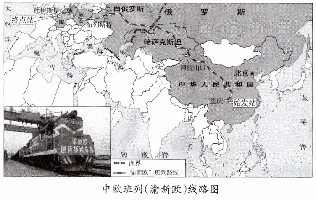“一带一路”相关国家开展了一大批互联互通项目,如中欧班列、中老铁路、中吉乌铁路、中国—中亚天然气管道线、中巴经济走廊等。下图是“中欧班列(渝新欧)线路图”。据此完成下列8~9题。