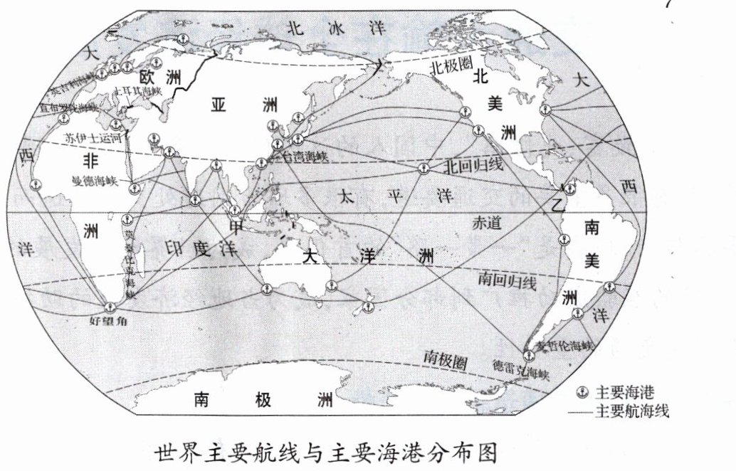 许多海上交通要道被称为是“海上咽喉”,如苏伊士运河、马六甲海峡、巴拿马运河等。这些海上运输通道在世界贸易中均扮演着重要的角色。下图为“世界主要航线与主要海港分布图”。据此完成5~7题。