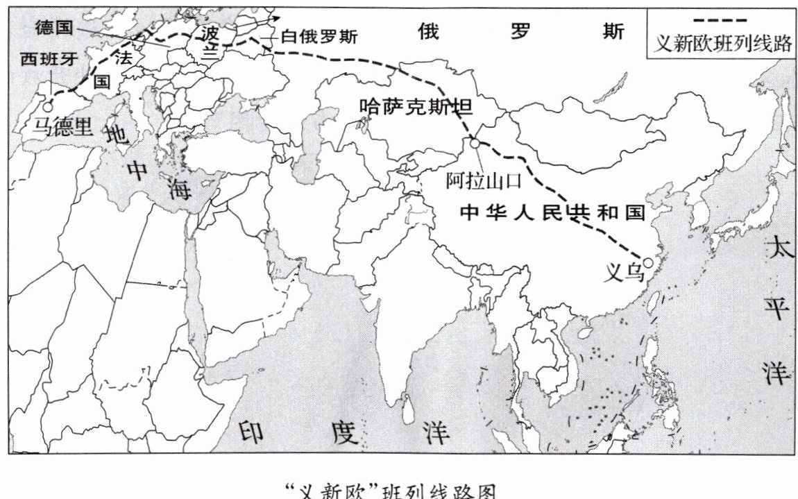材料三 下图是“‘义新欧’班列线路图”(从浙江义乌出发,经新疆阿拉山口口岸出境到西班牙马德里)。