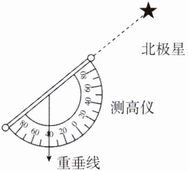 实验过程 选择一个晴朗的夜晚,按照图示方式将测高仪对准北极星。测高仪上的重垂线与零度线的夹角,就是当地地观测到的北极星的高度角,即当地地理纬度。右图示意小明家的地理纬度测量结果。(注意:重垂线与地平线垂直,测高仪0°刻度线延长后与测高仪底边垂直)