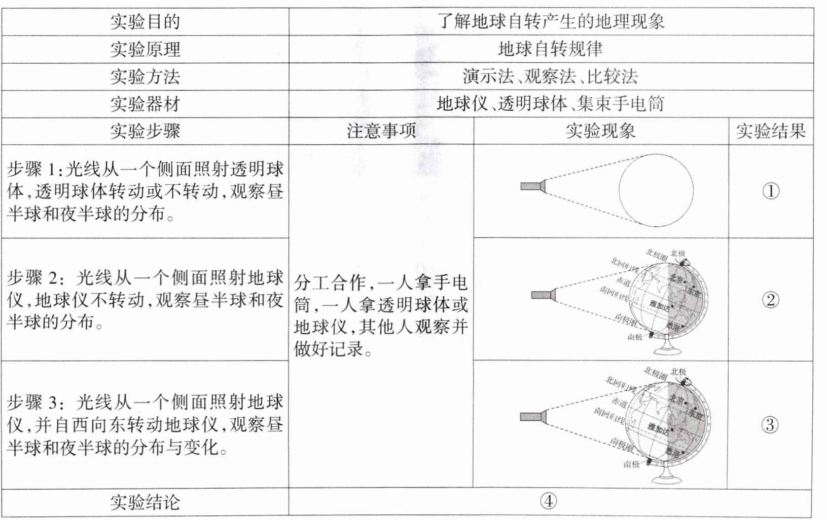 宁夏某中学地理老师为了和同学们一起探究“地球自转产生的地理现象”,特设计了如下地理演示实验方案。