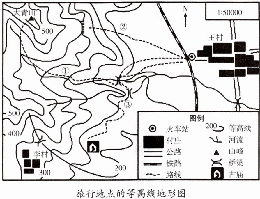 ![旅行地点的等高线地形图(有等高线,标注大青山、王村、李村、古庙,比例尺1:50000,图例有火车站、村庄、公路、河流、山峰、桥梁、路线)]