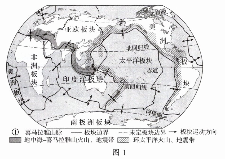珠穆朗玛峰是喜马拉雅山脉的主峰。2020 年 12 月 8 日,中国与尼泊尔共同宣布了珠峰的“新身高”为 8848.86 米,刷新了 2005 年珠峰海拔 8844.43 米的记录。图 1 示意全球六大板块与部分主要火山、地震带的分布,图 2 示意喜马拉雅山脉的形成过程。据此完成 8~9 题。