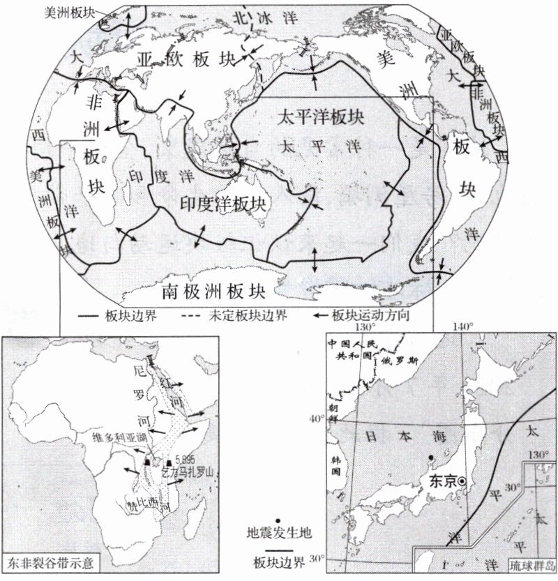 世界上的地震的产生与板块运动密不可分。 分布在板块交界处的日本、肯尼亚等国地震灾害频发。地震在带来巨大灾难的同时也使得地表变化和形成裂谷。下图示意世界六大板块的分布、东非裂谷带的位置和 2024 年 1 月 1 日日本地震发生地的位置。据此完成 4~6 题。