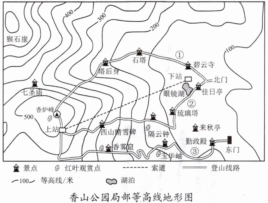 深秋时节,香山公园红叶渐浓,登山赏秋人群络绎不绝。下图为“香山公园局部等高线地形图”。据此完成 6~8 题。