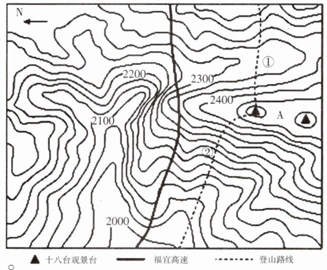 (1)推荐①登山路线,理由是①登山路线等高线稀疏,是个缓坡,登山比较省力。(答案不唯一)