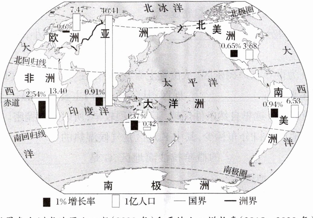 。(4)从“世界各大洲或地区人口数(2020 年)和平均人口增长率(2015—2020 年)”图上看,人口自然增长率较高的四个大洲是